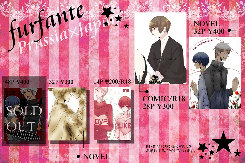 マジで原稿すすまない。身体ボロボロ。急げ自分・・・ううう(うω;´) なんか色々止まってて申し訳ない。本当に申し訳ない。 でもはっきり言って限界なんです最近いろいろ。 毎日死にそうになってる。やだやだお! 拍手返信 2010.08.04 Wed 13:02:00 心臓痛いわ![]() (w>//<)。0(きゃー!ギルベルトさん!きゃー!!) な菊ちゃん。だめだぷにち愛しくて死ぬ。 思いのほかリアルがごたごたしてて原稿がすすみません。畜生。 2冊いけるかなーいきたいおー。っていうか 2冊目の表紙ができてて1冊目の表紙がまだっておかしいよね^^ A、1冊目の表紙塗り B、1冊目の中身 C、2冊目の中身 今A,B同時進行中。やるんだ僕。 擬人化までにノベルティしおりも作ってみたいであります。 拍手へんしーん!(普ω日) 2010.07.30 Fri 12:11:00 ラジオについて今使ってるラジろぐの配信サービスがなくなるそうです。 2010.07.30 Fri 10:47:00 週末「俺はお前の味方だぜ」 まだ遊んでる俺をちょっと蹴ってくれないk 週末さんががんばれって言ってくれてるみたいだからがんばる。 ちなみに原稿は小説だから、漫画は遊んでるだけだkr(普ルボッコ) 最近の暑さぱねえ_ノ乙(*、ン、)_ ギルベルトさんの心境の変化っていうか成長 プロイセン:不安だし寂しいから、菊の肌がぶがぶ噛みまくって跡つけまくる オスト:いつでもイチャイチャできるからキスマーク上書きする程度、優しい とかいう妄想をだな!した!!ちょっとずつ丸くなっていく普可愛い。 でも嫉妬深いのは変わんないといいな。独占欲萌え萌え(´▽`*) ・仕事「今夜は寝かさないぜ?」「お前だけは離さねえ」 ・仕事「お前さえいればそれでいい」「もっと一緒にいたいんだ」 …お願い帰って。゚( ゚^o^゚)゚。 ・ナカツ「りぃ…ずっと一緒にいよう?」 ・りぃ「ナカツ!お前だけは離さねぇ!」ガシ!! お願い帰らないで。゚( ゚´ω`゚)゚。 ・しおんさん大好きぎゅっぎゅ・・・おっぱい ・モルト蘇生術募集、さて人口呼吸^^33333 ・(「・ω・)」<アチョー!!! |